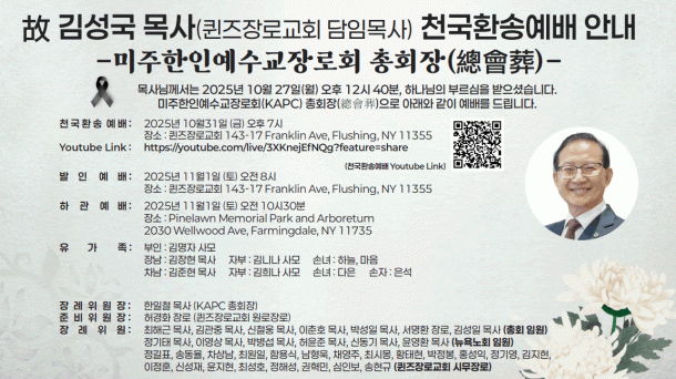 고 김성국 목사의 장례가 미주한인예수교장로회(KAPC) 총회장(葬)으로 드려진다. 장례예배는 10월 31일 금요일 저녁 7시 퀸즈장로교회 본당에서 거행되며, 총회장 한일철 목사가 설교를 맡는다. 발인예배는 11월 1일 토요일 오전 8시 동 교회 새성전에서 드리며, 하관예배는 같은 날 오전 10시 30분 파인론(Pinelawn)에서 퀸즈장로교회 인도로 진행된다.