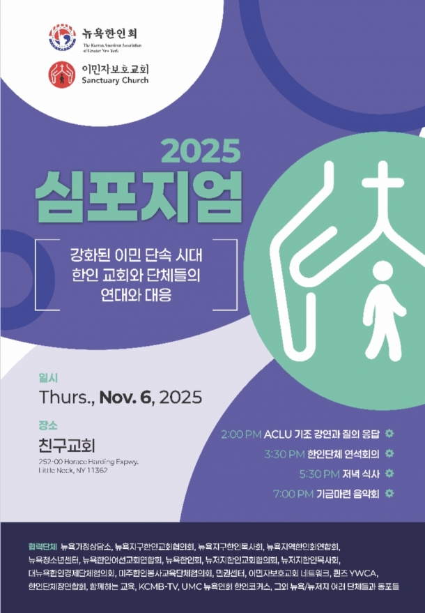 이보교와 뉴욕한인회가 공동 주최하는 '2025 심포지엄과 ACLU 및 한인 커뮤니티 기금 마련 콘서트'가 오는 2025년 11월 6일(목) 오후 2시, 리틀넥에 위치한 친구교회(빈상석 목사)에서 열린다. "강화된 이민 단속 시대 한인교회와 단체들의 연대와 대응"이라는 주제 아래, 이민자보호교회네트워크 회원 교회들은 물론, 뉴욕한인회, 뉴욕교협, 뉴욕목사회, 뉴저지교협, 뉴저지목사회 등 교계 단체와 뉴욕지역한인회연합회, 미주한인봉사교육단체협의회(미교협), 민권센터, 뉴욕가정상담소 등 한인 사회의 주요 단체들이 대거 동참한다.